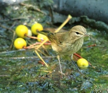 Warblers are the largest family of songbird migrants, although the cryptic sparrows become quite numerous later in the fall as winter residents, and flycatchers have made a strong showing in September. These three families dominate the songbird migrant scene and lead to the amazing diversity which is the spring or fall migration. This is the nondescript Palm Warbler, which is actually a winter resident in various areas of the Upper Texas Coast (and the South). Texas birds are usually the Western Palm, drab and found more in open areas. The Northern Palm Warbler is yellower and found more in pine forests of the coastal plain. These are races of one species, the Palm Warbler, but unlike most avian races, they are quite distinctive and separated ecologically (that means a different habitat).