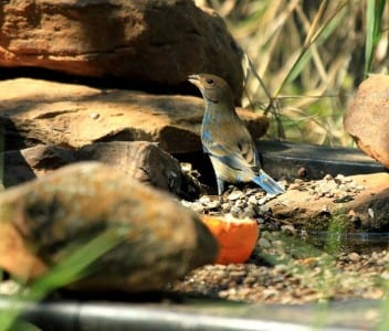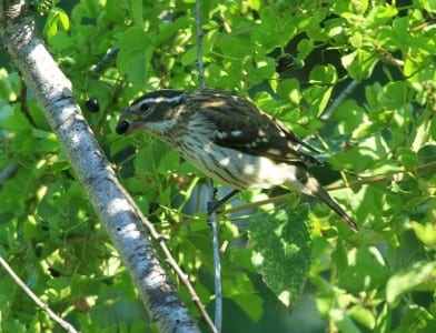 Grosbeaks are much larger than buntings and love fruit! This is a female Rose-breasted Grosbeak, looking more like a huge sparrow than a finch. This species passes through the Gulf coast in large numbers in early October, then returning mostly in April. Curiously, this species is extremely tame while the Blue Grosbeak of open fields is wary as all get-out. Isn’t it curious how some birds are wary and others are tame?
