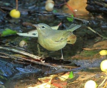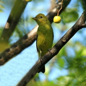 There are those who wouldn’t believe this was a male Scarlet Tanager! In fall, while the Summer Tanager males stay red, these tanagers say, “Frankly, scarlet, I don’t give a dang.” And theyturn green. When they return in April there is no telling what the males will look like, with all kinds of bizarre mixes of green and red. By May, most males are scarlet with their telltale black wings.
