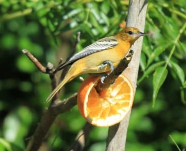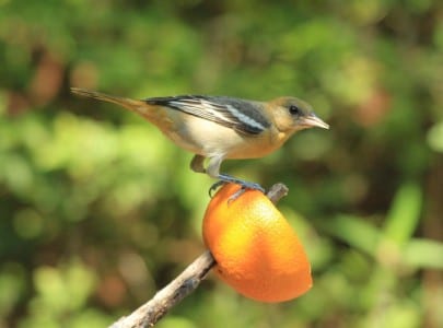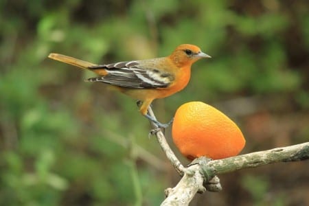 The family of orioles represents both beauty as well as some tough identifications. Just as red is a tanager color and blue is a bunting color, orange is the hue we think of when pondering orioles. The long, sharp bill is handy for the nectivorous life and social gatherings are often found around oranges and other fruit. A word of caution about Baltimore and Bullock’s Orioles: These two species, which were recently considered one species, can be extremely hard to separate in certain plumages. My suggestion would be a recent field guide and hard study. Female Orchard and Hooded Orioles are also very challenging, so beware!
