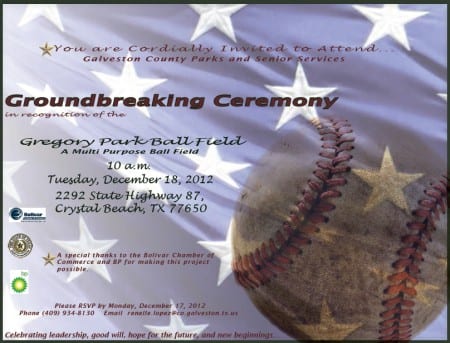 You are Cordially Invited to attend Galveston County Parks and Senior Services Groundbreaking Ceremony in recognition of the Gregory Park Ball Field, Tuesday, December 18, 2012, at 10 a.m. A special thanks to the Bolivar Chamber of Commerce and BP for making this Multi Purpose Ball Field project possible…celebrating leadership, good will, hope for the future, and new beginnings.