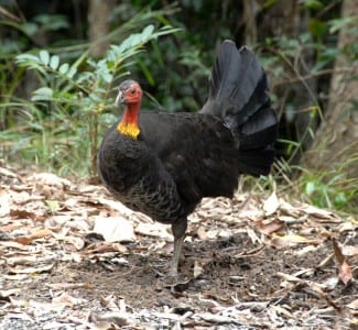 The Australian Brush-Turkey is one of three mound-builders, a fascinating method of nesting. They, the Red-footed Scrub-Fowl and theMaleefowl of Southern Australia all turn around and scrape up a huge mound of leaves and ground litter for a “nest.”The female lays her eggs in the top hole, making the mound look something like a volcano. This is not the entire story. Every few days the female returns and sticks her bill into the hole where the eggs are covered up and ascertains the temperature of the eggs. If they are too hot she removes some leaves, but if they are too cool, she adds stuff on top of them. It’s an ingenious way to incubate eggs without being present.