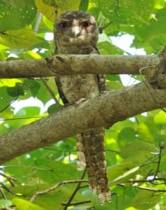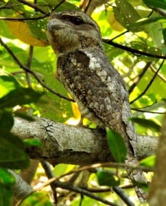 Here is the Papaun Frogmouth, a goatsucker that’s distantly-related to our nighthawks and Whip-poor-wills, etc. By day they hide in dark patches of forest but my secret weapon (Liz) spotted the female. Later, I found the male (above), which is grayer than the gal. These are insectivorous and often the victims are beetles. Now, if you wanna see some real tree-bark camouflage, check this out: He looks like an octopus, the way the “coat” is exactly the color of the surroundings (bark). This family (goatsuckers, New World; nightjars, Old World) has small bills but huge gapes, small feet, very thin skin and monstrous eyes. These males are big-headed but I am not sure why.