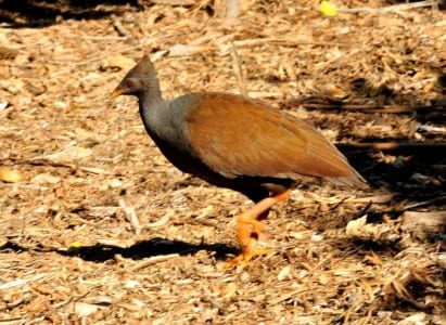 The other mound-builder in Queensland is the Orange-footed Scrub-Fowl, a chunkier bird than the preceding. Their feet (and legs) look like those of White-fronted Geese and the crest gives it a regal look. Well, sorta. You can see what great camouflage they have in the reddish earth’s shadows and they also run quite well. But if all else fails, they can fly in rapid bursts, not unlike quail.