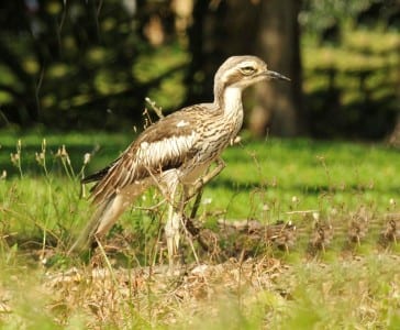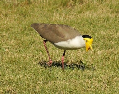 There are plovers and there are plovers. This is theMasked Plover, a large shorebird with a face that suggests the Phantom of the Opera. They still have the plover habit of feeding on small animals on the ground and like some others; they almost prefer grass to beach. The wicked secret these hide is their spur on the bend of the wing that males use in combat. It belies their mild-mannered appearance.