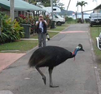 One of the most enormous and frightening beasts on Earth is shown here with Liz, and is called the cassowary. Liz is the one behind. We are in a lovely community called Mission Beach, famous for its cassowaries. This old male wanders through the park every day, looking for kibbles and bits, and holding up traffic, human and otherwise. Cassowaries will appear in a future PDF with a little more science and a little less goofiness.