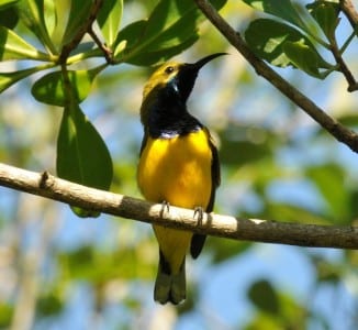 This Olive-backed Sunbird is preening, an important chore for all birds. You can see his primaries, though, which aren’t easy to get good looks at. Most songbirds have 9-10 primaries and the shape of the wing is determined by the length of their primaries. Sunbirds have rounded wings for short flight and you can see the longest primary is about the third one. Birds like ducks, shorebirds and falcons that have “pointed” wings have their longest primaries first and each ensuing one is shorter.