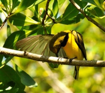 This is a poorpicture of a honeyeater, a huge family of songbirds in Australia. These are not to be confused with the honeycreepers ofthe American Tropics, with their long, sickle bills and brilliant colors. These honeyeaters are like the warblers of Australia and occupy about every imaginable niche. This is the Mangrove Honeyeater, and of course, lives in the coastal forests.
