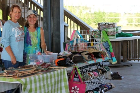 Paula Broussard and Karen Reneau showing their original caps, bags and paintings