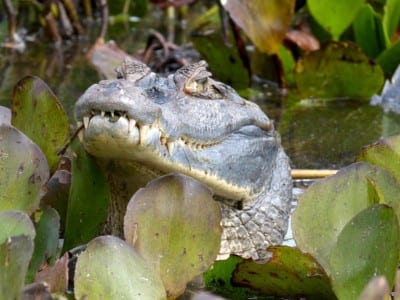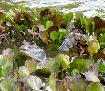 Spectacled Caiman are small members of their group, with caimen being one of four groups of crocodilians in the World. These are quite harmless, although the Black Caiman further south has been reported to occasionally be aggressive. Having swum with that species in Peru (Lake Lemoncocia), I reserve judgment.