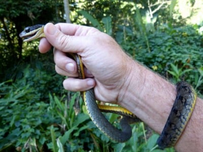 Some of us just can’t stay away from reptiles – especially ones without legs. This Masked Racer was hiding at the top of Rancho Grande in Henry Pittier National Park – right on the cliff. When he took off, so did I! Taking care not to plunge straight down, I grabbed the scaly beast and ran my hand up behind its head. For you experts, notice how much his aft looks like the pattern and color of a fer-de-lance! Wow, is that mimicry?!?