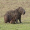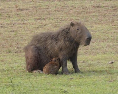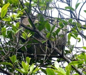 Mammals are named for their milk-producing glands, although they don’t seem to add to this creature’s attractiveness like, well, never mind. This is mother Capybara and her pint-sized pup, the largest rodent in the World. Anaconda food. 😉 One of the hardest mammals to spot is the sloth, but I knew this couldn’t just be a mass of leaves! There are two species of New World sloths, the Two- and Three-toed Sloth. Can you tell from this pictures which it is?