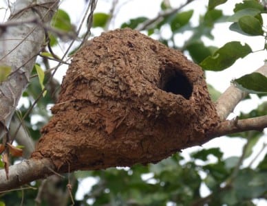 This is the nest of the Pale-legged Hornero, a beautiful, rich-brown bird of low, wet areas. Obviously, the nest was put together with mud and plant material, which saves on vacuuming.
