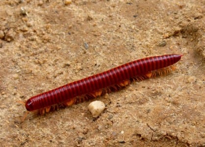 Most of the million or so species of arthropods live in the Tropics, with this millipede on the prowl for kibbles and bits. Millipedes are harmless, defending themselves with a hard exoskeleton, a pungent repugnatorial gland up front and the ability to roll up in a ball. Centipedes are a very different group, with one pair of (longer) legs per somite (segment) (reaching out to the side), a flatter body, and the ability to bite the @#$% out of you (as I have learned and reinforced in my *now* long life.)