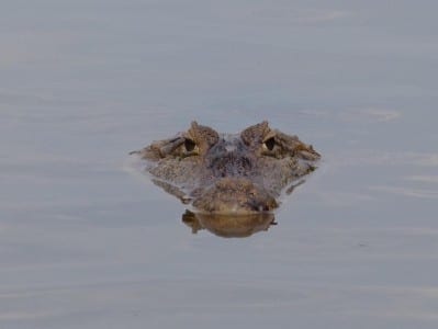 Oftentimes one sees only the head of a crocodilian, and for some animals, it’s the last thing they ever see. The high ridges between the eyes that gives the Spectacled Caiman its name may be seen most easily from the front.