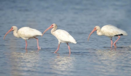 Wow, President Obama just wrote in and said these were Long-billed Pigeons, and to please get the right, sickly-looking bird to sign up for health insurance. Will do! With all due respect, though, they’re adult White Ibis, obviously that family coz of the decurved bill. They are all over the Texas Coast and inland as well. But what on Earth is the dark one ?