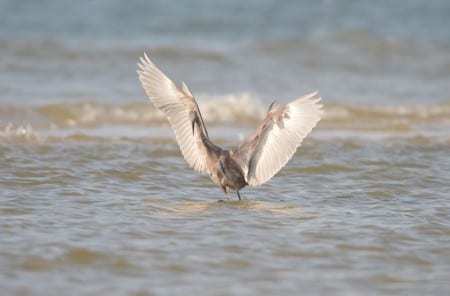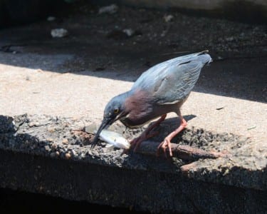 This is the beautiful Snowy Egret, with black legs and bill, p lus the “golden slippers” they are famous for. He’s got quite a mouthful! Now, what on Earth is this brownish-gray wader with his wings out?
